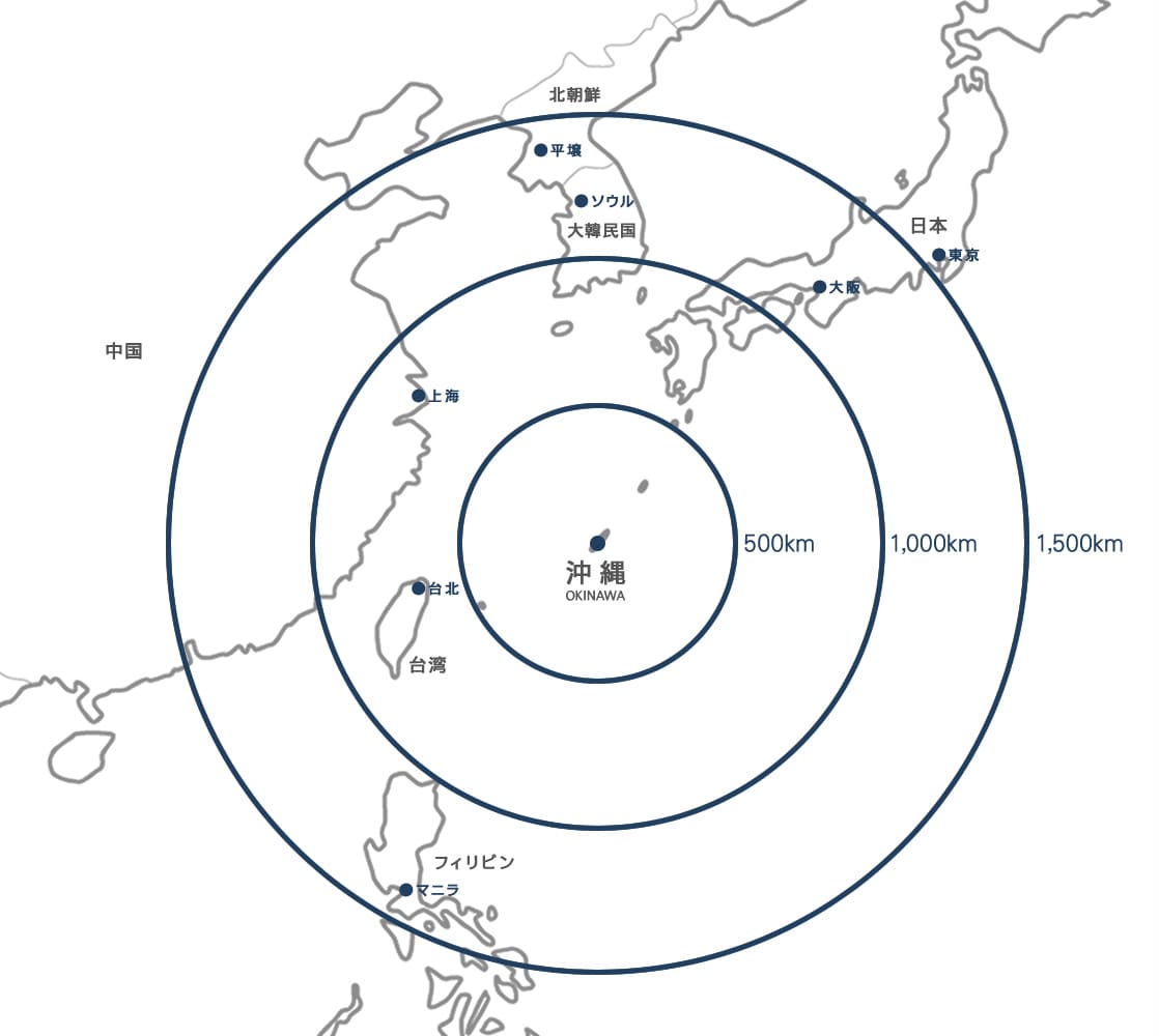 沖縄県の那覇市(なは)を中心にして円をえがくと、台湾(たいわん)や中国の上海(しゃんはい)などが、九州とほぼ同じきょりにあることがわかります。また、フィリピンのマニラや韓国(かんこく)のソウルなどが、東京より近いこともわかると思います。私(玉城 昇)が、創業当時から台湾、フィリピン、ベトナム、タイ、ミャンマーなどからの貿易、現在では、韓国への輸出などを手掛けてこれたのも沖縄がグローバルな位置に点在しているおかげですね!